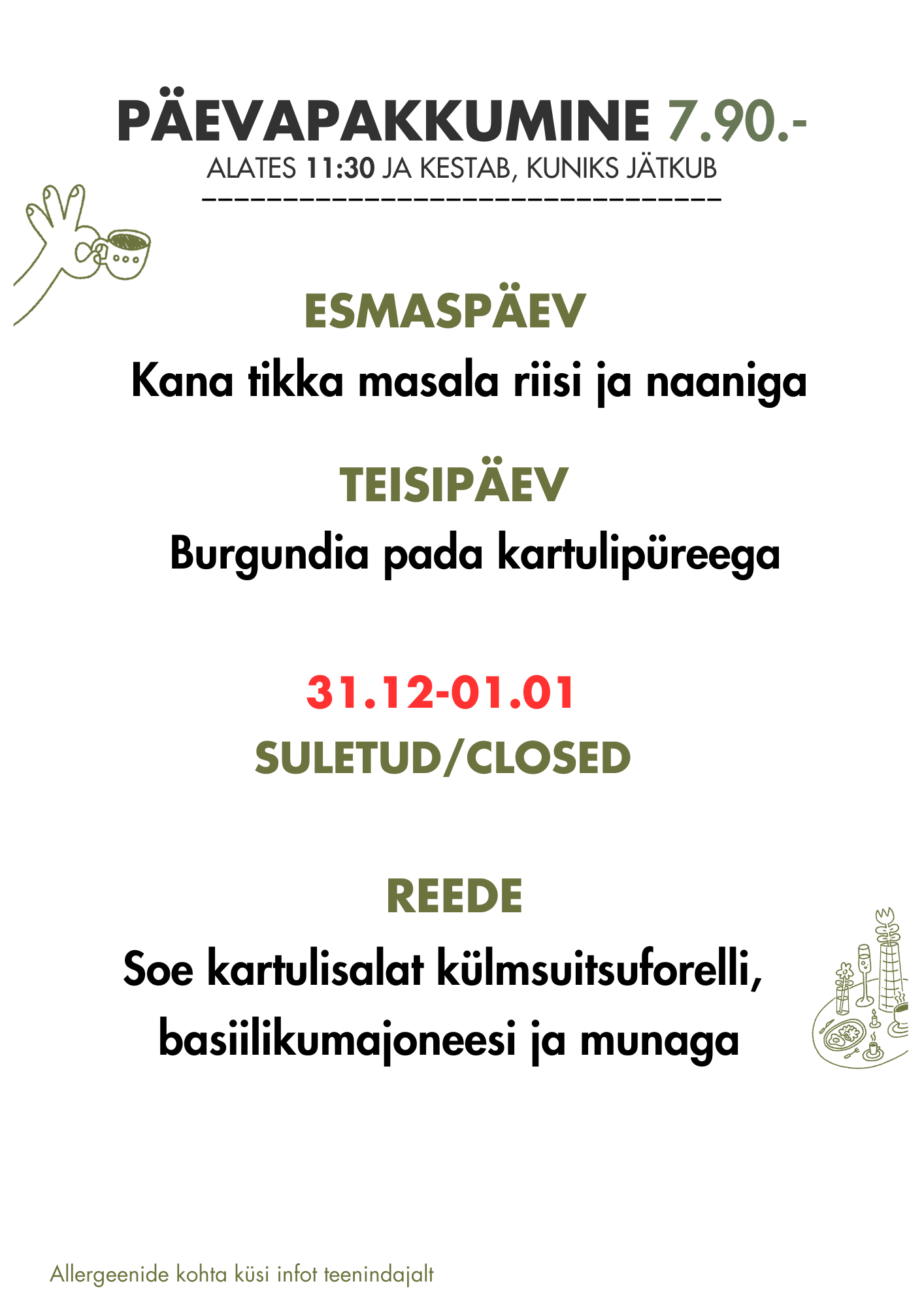 Kohviku menüüd värskendame aastaajale vastavalt, tuues sisse hooajale omaseid saaduseid ja maitseid.